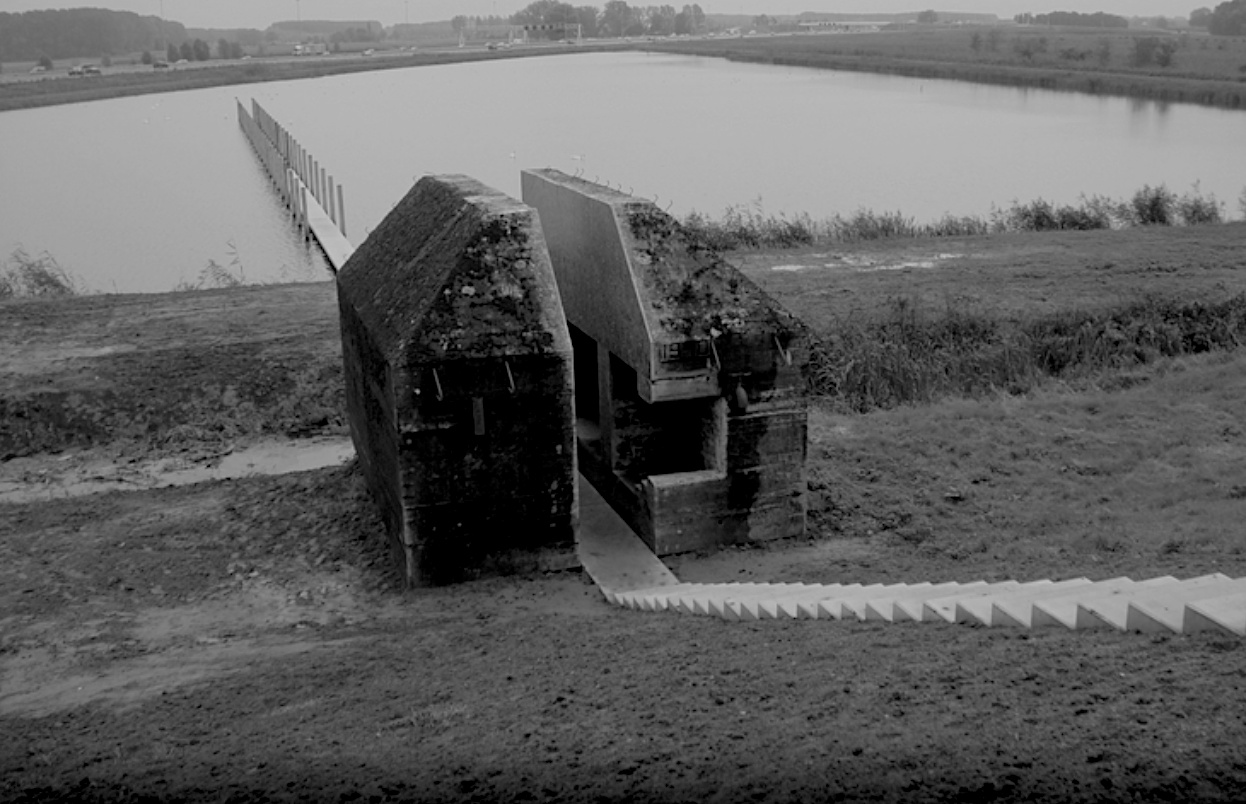 ‘Bunker 599’ by Dutch firms Atelier de Lyon and Rietveld Landscape is a project which lays bare two secrets of the New Dutch Waterline (NDW), a military line of defence in use from 1815 until 1940 protecting the cities of Muiden, Utrecht, Vreeswijk and Gorinchem by means of intentional flooding. A seemingly indestructible bunker with monumental status is sliced open. the design thereby opens up the minuscule interior of one of NDW’s 700 bunkers, the insides of which are normally cut off from view completely. In addition, a long wooden boardwalk cuts through the extremely heavy construction. it leads visitors to a flooded area and to the footpaths of the adjacent natural reserve. the pier and the piles supporting it remind them that the water surrounding them is not caused by the removal of sand, but rather is a shallow water plain characteristic of the inundations in times of war. The sliced up bunker forms a publicly accessible attraction for visitors of the NDW. it is moreover visible from the A2 highway and can thus also be seen by tens of thousand of passers-by each day. The project is part of the overall strategy of the designers to make this unique part of dutch history accessible and tangible for a wide variety of visitors.